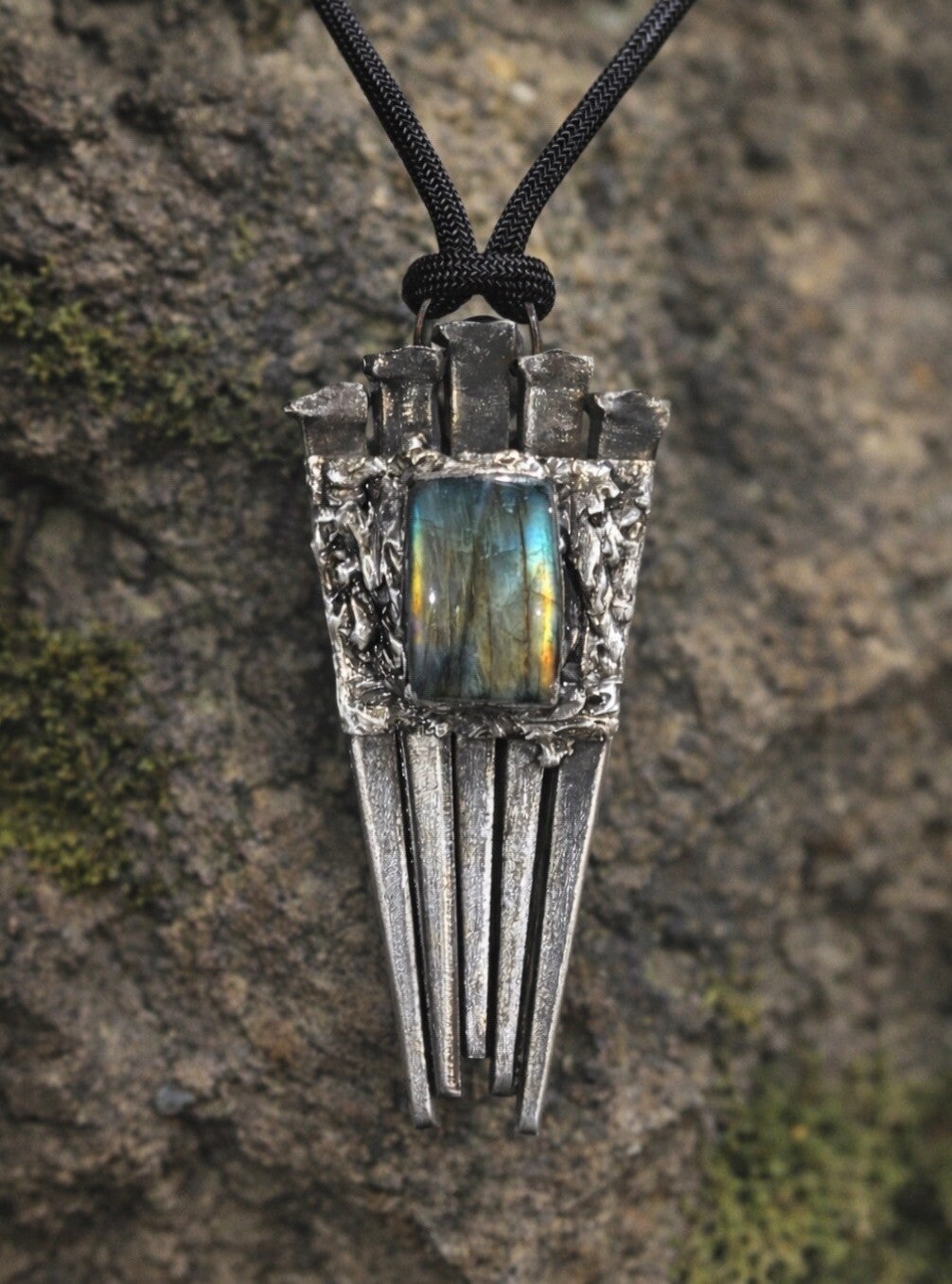 Five hand forged antique iron coffin nail pendant with labradorite