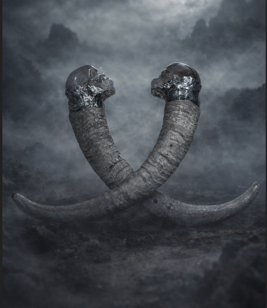Handcrafted Ram Horn + Smokey Quartz Skull Ritual Pieces