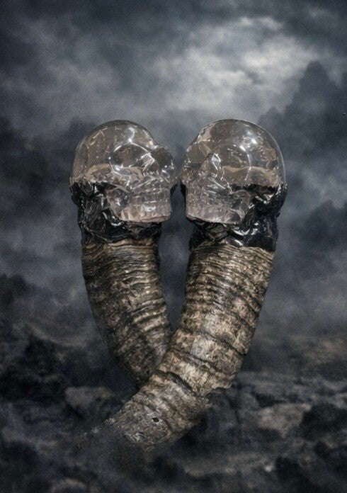 These one-of-a-kind pieces combine natural ram horns with carved Smokey Quartz skulls, creating a striking altar or display object.